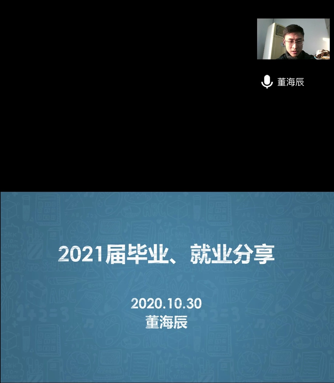 负责就业工作的董海辰分享了2021届毕业、就业的相关事宜。五年数据的回顾,清晰地展示了往年的就业率与深造率,老师还是希望毕业年级能认真考虑自己今后的方向,衡量就业与深造之间的利弊;毕业生找工作有很多方式,毕业年级的同学要多搜集信息,利用一切资源找到自己心仪的工作,自己的三方协议也要慎重考虑;除深造、就业,毕业年级也可以考虑参军入伍、西部计划、三支一扶等国家项目。坚定自己的目标,为之努力。