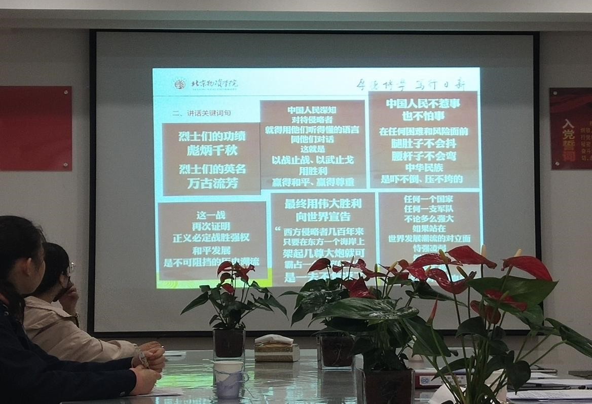 此次会议的主题是了解抗美援朝的历史,从中学习领会共产党人顽强不屈的伟大精神,牢记历史,不忘初心。并将这些精神运用到自己的学习生活与工作中,时时刻刻用共产党人的标准来严格要求自己,提升自己的政治觉悟与修养。