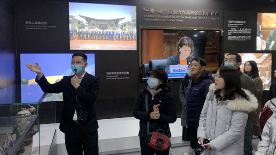 随后,大家坐车前往怀柔参观雁栖湖国际会议中心。在讲解员的带领下,参观师生走进肃穆庄严的国际会议中心,欣赏精美的室内装饰和富有中华文化特色的建筑艺术,了解国际会议中心的使用情况及相关礼仪规范。室内讲解结束后,一行人来到正门外远观国际会议中心,该建筑恢弘的气势使大家深刻领悟中国文化魅力,深切感受到APEC会址焕发出的“鸿雁展翼,汉唐飞扬”的中国风采以及彰显出的国家自信和民族自强。随后,参观师生在国际会议中心园区内举行了徒步活动,大家一边远眺崇山峻岭中的慕田峪长城,一边欣赏身边的一步一景,体验中国园林之美。