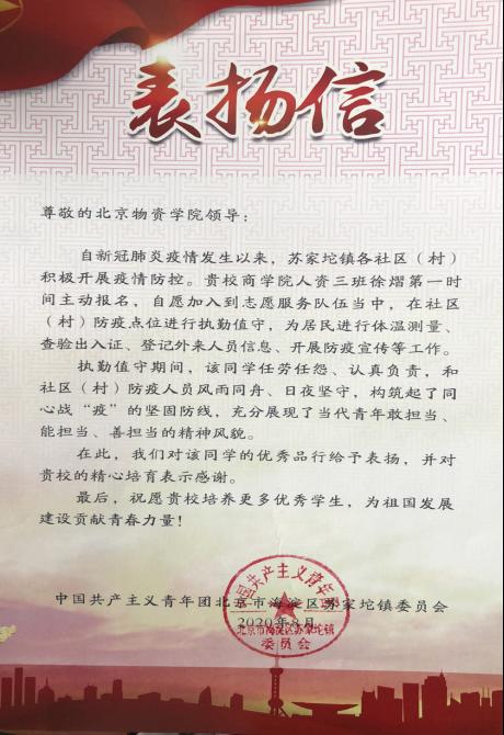2018级人资专业徐熠同学在疫情发生以后,第一时间主动报名,自愿加入到志愿服务队伍当中,在社区(村)防疫点位进行执勤值守,为居民进行体温测量、查验出入证、登记外来人员信息、开展防疫宣传等工作。执勤值守期间,他任劳任怨、认真负责,和社区(村)防疫人员风雨同舟、日夜坚守,构筑起了同心战“疫”的坚固防线,充分展现了当代青年敢担当、能担当、善担当的精神风貌。北京市海淀区苏家坨镇团委向徐熠同学的优秀品行给予表扬,并对北京物资学院的精心培育表示感谢。