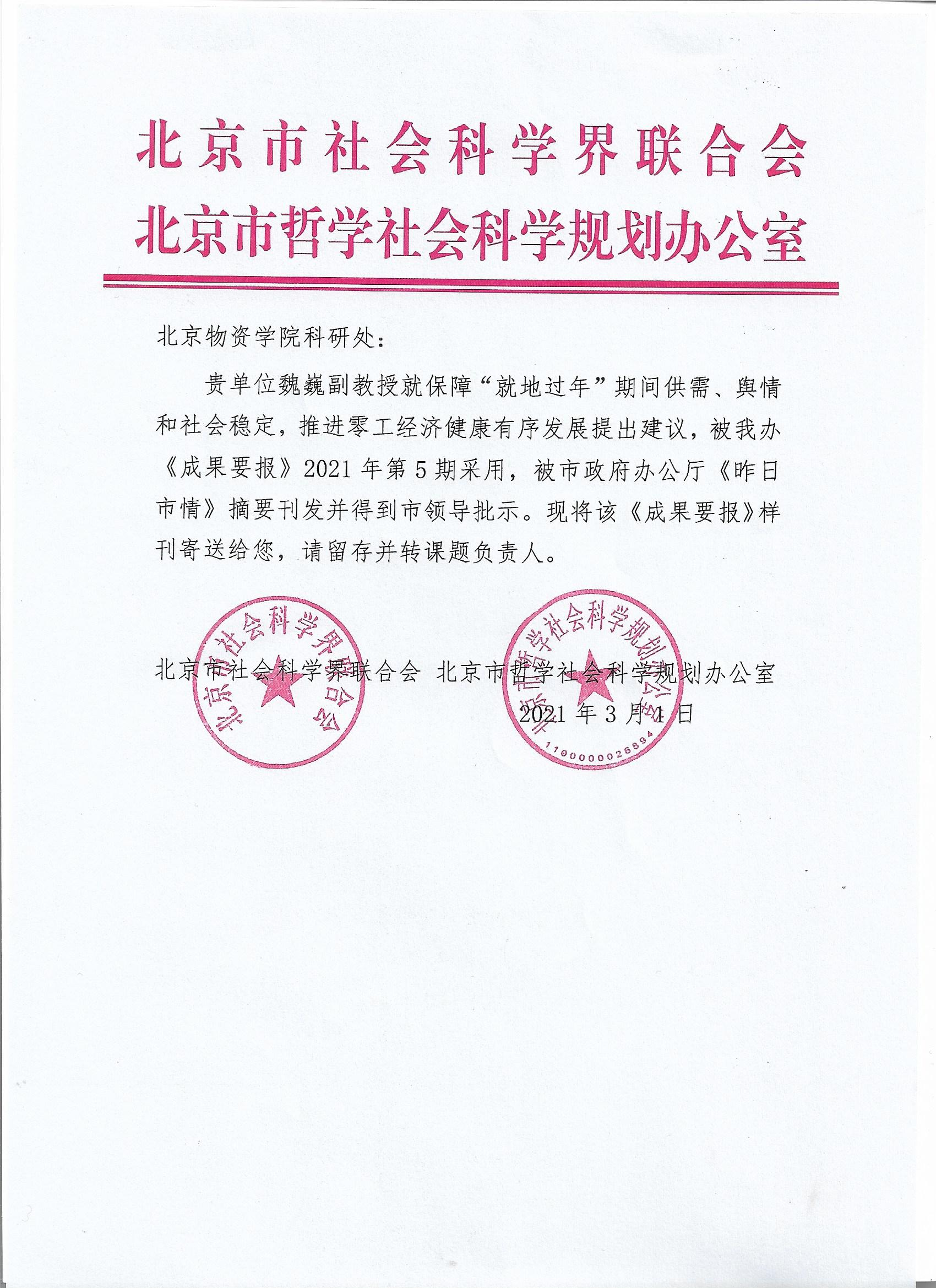 魏巍副教授及团队成员的项目研究成果《保障疫情期间居民“就地过年”服务供给 推进北京地区零工经济健康发展的建议》被北京社科基金项目《成果要报》2021年第5期采用,被市政府办公厅《昨日市情》摘要刊发并获得北京市领导的肯定性批示。魏巍副教授长期聚焦新就业形态研究前沿,坚持问题导向,就推进北京地区零工经济健康发展和加快推进职业伤害保障试点提出了科学观点和对策建议,为服务首都发展做出了贡献。本文是其主持研究的国家社会科学基金年度一般项目“新业态下平台型企业非典型就业的权益保障困境及制度创新研究”课题的成果之一。