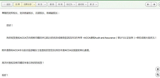 2018级会计学(ACCA)方向班熊司晴同学以81分荣获该课程中国内地单科第一名,这是我校ACCA实验班创办以来的又一次标志性成果。