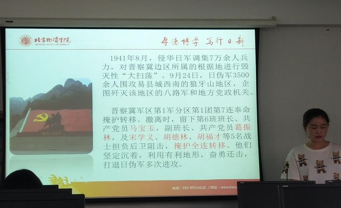 首先是由支部副书记刘怡婷同志进行的分享,她带来的是“狼牙山五壮士”的故事,分别就故事发展梗概以及在这五位壮士的身上我们可以传承的、发扬的、运用到实际生活中的伟大精神给同学们带来了精彩的分享。