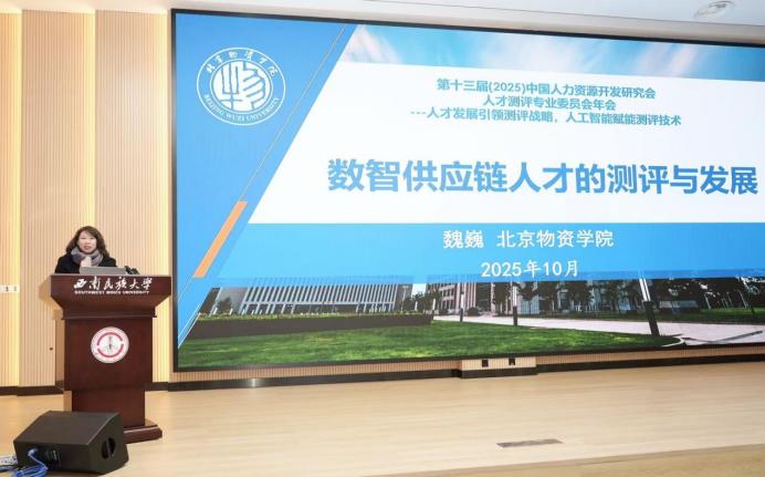 魏巍教授受邀出席本次盛会,并在大会主题论坛环节做《数智供应链人才测评与发展》专题学术报告,其研究成果的系统性与创新性受到与会专家的广泛关注。