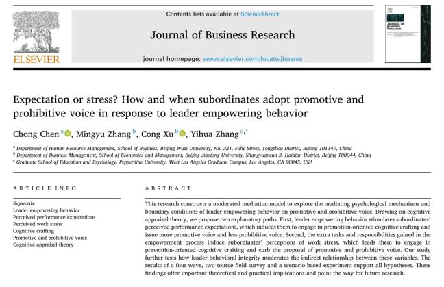 人力资源管理系青年教师陈冲博士在国际权威期刊《Journal of Business Research》(AJG/ABS 3*,中科院一区,IF = 9.8)发表题为 “Expectation or stress? How and when subordinates adopt promotive and prohibitive voice in response to leader empowering behavior”的最新研究。该研究为北京市属高校基本科研业务费专项项目(2025JKZX12)的阶段性研究成果。