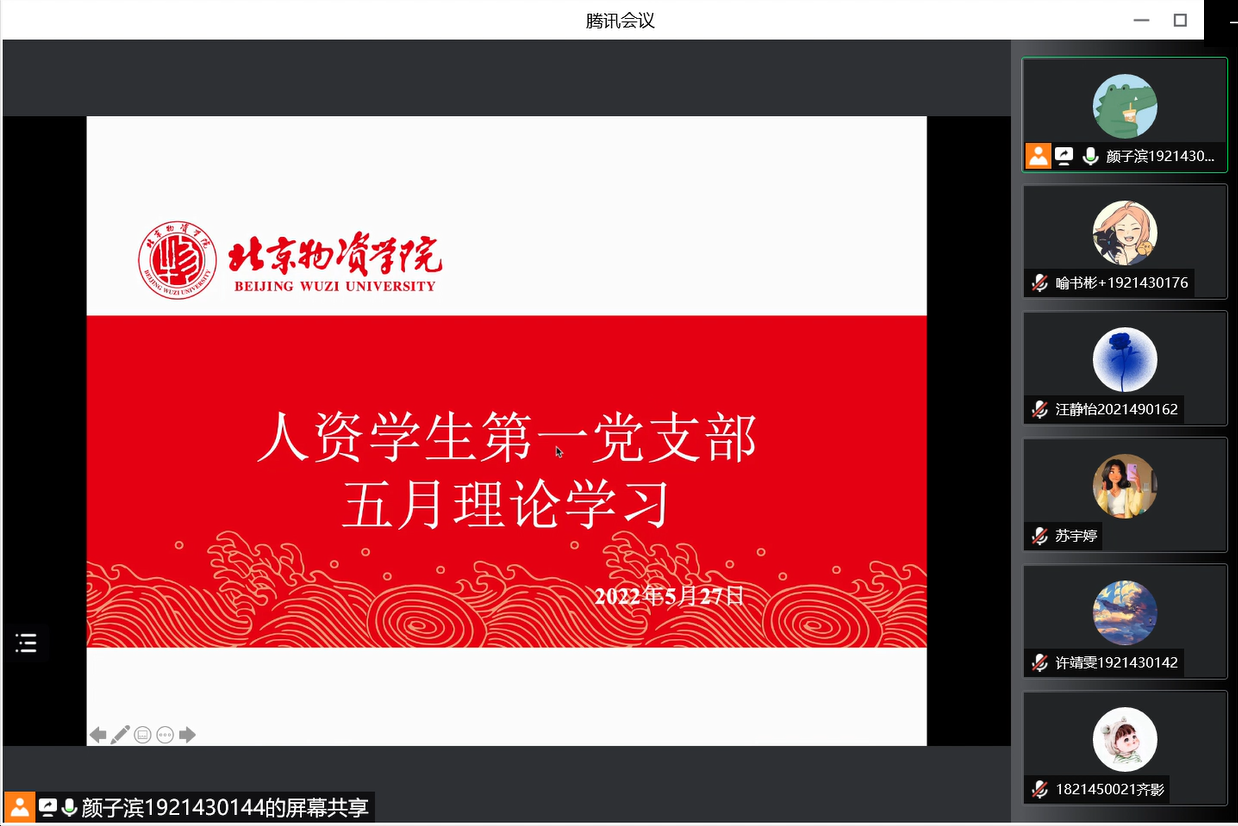 人力资源管理学生第一党支部在腾讯会议线上召开了五月的理论学习会。本次座谈会由人资学生第一党支部书记董海辰老师主持,学生第一党支部全员参与。