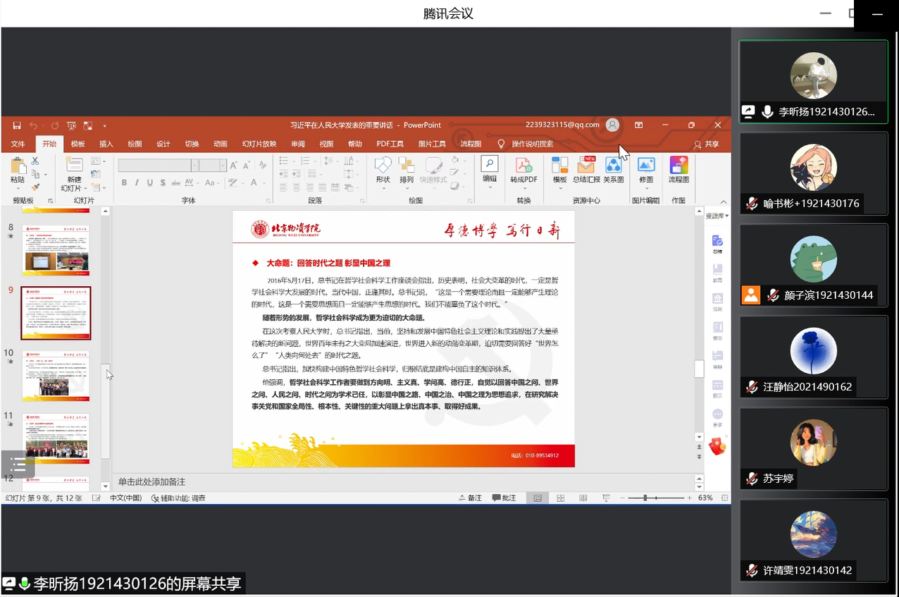 首先,由李昕扬同志分享学习习近平总书记在中国人民大学考察时重要讲话精神的感受。其背景为五四青年节即将到来之际,习近平总书记于25日上午来到中国人民大学考察调研。习近平总书记代表党中央,向全国各族青年致以节日的祝贺,向中国人民大学全体师生员工、向全国广大教育工作者和青年工作者致以诚挚的问候。并且详细解读本次讲话精神,强调要扎根中国大地办大学,走出一条建设中国特色、世界一流大学的新路;“思政课的本质是讲道理”,推动大中小学思政课一体化建设形成大课程;建构中国自主的知识体系本质上是为构建中国特色哲学社会科学;教师要成为大先生;高校要成为锻造优秀青年的大熔炉。