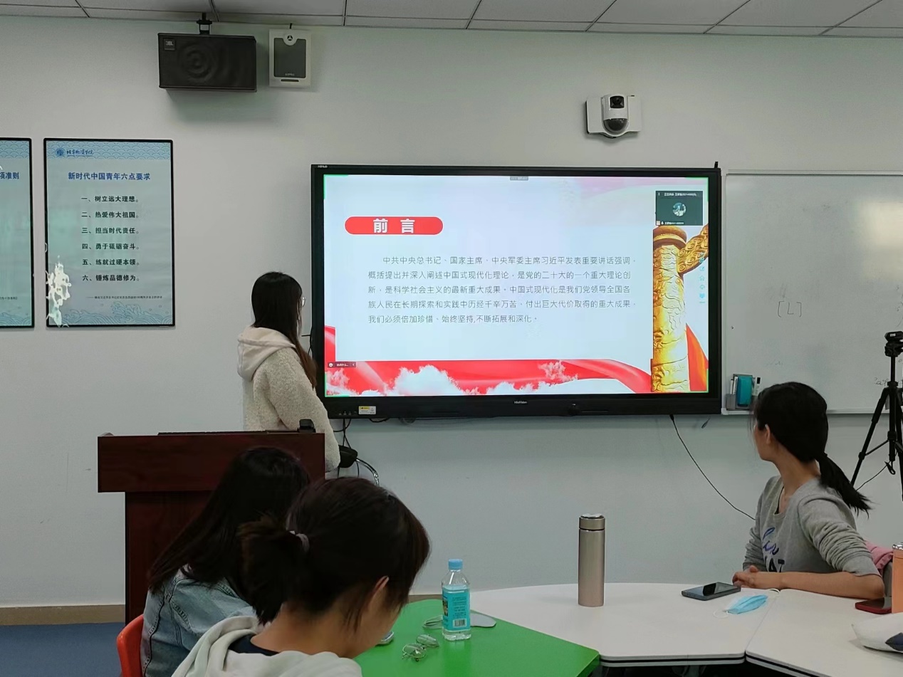 会议伊始,由马鑫同志带领党支部成员展开对二十大精神的学习。马鑫同志首先带我们回忆了中国共产党的百年党史,包括新民主主义革命时期、新中国成立后、改革开放和社会主义建设新时期,最后表明探索中国现代化道路的重任落在中国共产党身上。其次,马鑫同志总结了党的十八大以来取得的历史性成就和历史性变革。最后,马鑫同志带我们学习了中国式现代的含义以及如何推进中国式现代化,并表明中国式现代化走得通、行得稳,是强国建设、民族复兴的唯一正确道路。