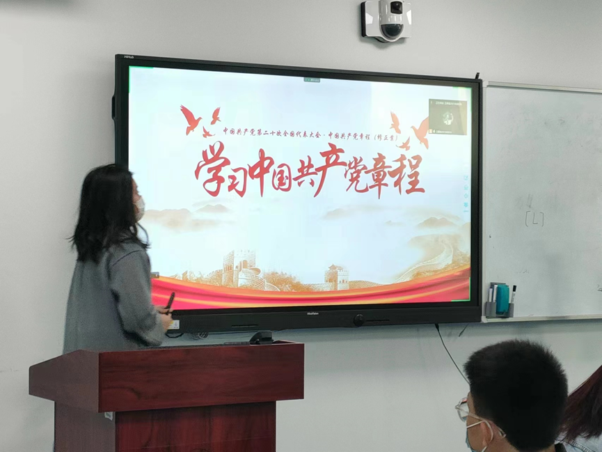 最后,由党支部书记杨柳依依同志作会议总结。新修改的党章从继续推进党的理论创新、推进党和国家事业发展、推进党的建设新的伟大工程出发,把我们党在推进中国特色社会主义伟大事业和党的建设新的伟大工程中取得的重大实践成果、理论成果、制度成果体现在党章中,实现了党章又一次与时俱进。认真学习党章、严格遵守党章,是学习贯彻党的精神的重要内容。学党章应该做到认真解读,踏实贯彻,长效落实,用自己实实在在的行动去实践,去体现。