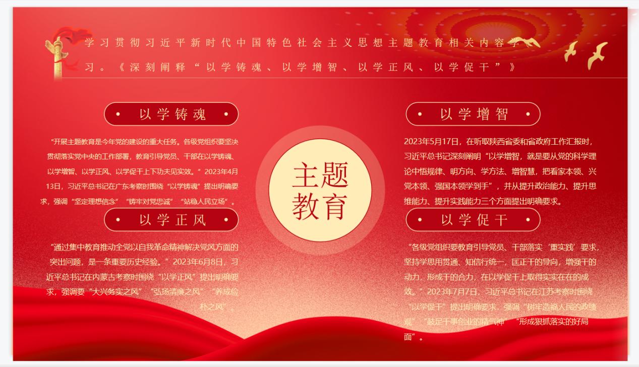 习近平总书记在学习贯彻习近平新时代中国特色社会主义思想主题教育工作会议上指出,开展这次主题教育,根本任务是坚持学思用贯通、知信行统一,把新时代中国特色社会主义思想转化为坚定理想、锤炼党性和指导实践、推动工作的强大力量,使全党始终保持统一的思想、坚定的意志、协调的行动、强大的战斗力,努力在以学铸魂、以学增智、以学正风、以学促干方面取得实实在在的成效。