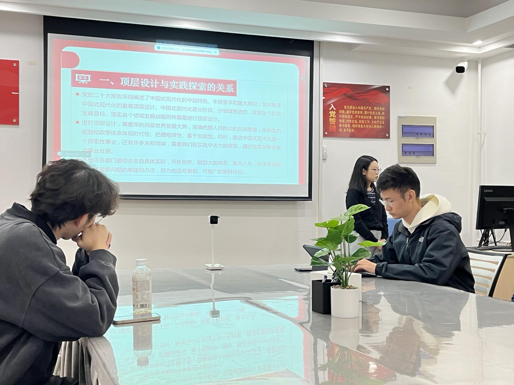2023年10月23日19:00,党支部组织全体党员在科研楼410召开理论学习会。此次会议由人力资源管理专业学生第一党支部书记董海辰同志主持。本次理论学习会主要围绕深入学习推进中国式现代化需要处理好若干重大关系的精神及相关内容。