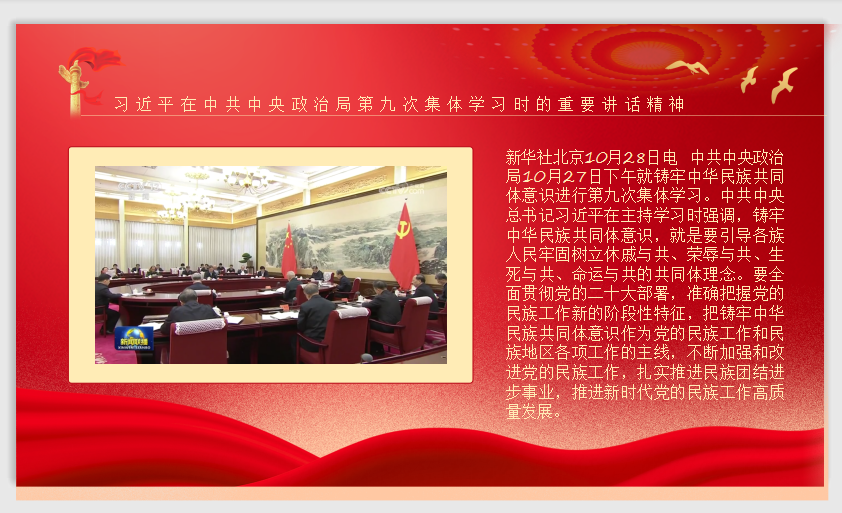中华民族在各民族交往交流交融中铸就,中华民族伟大复兴也必将在各民族交往交流交融中实现。党小组全体成员在本次政治理论学习后仍保持认真学习、深刻领会重要讲话精神的思想态度和行动力,做到准确把握精髓要义,坚持以习近平新时代中国特色社会主义思想为指引,将扎实推进铸牢中华民族共同体意识落到实处,以高度的政治自觉、强烈的使命担当,满怀信心奋进新征程、建功新时代。