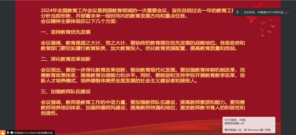 活动第三项,申奥琪同志带领大家一起学习2024年全国教育工作会议精神。