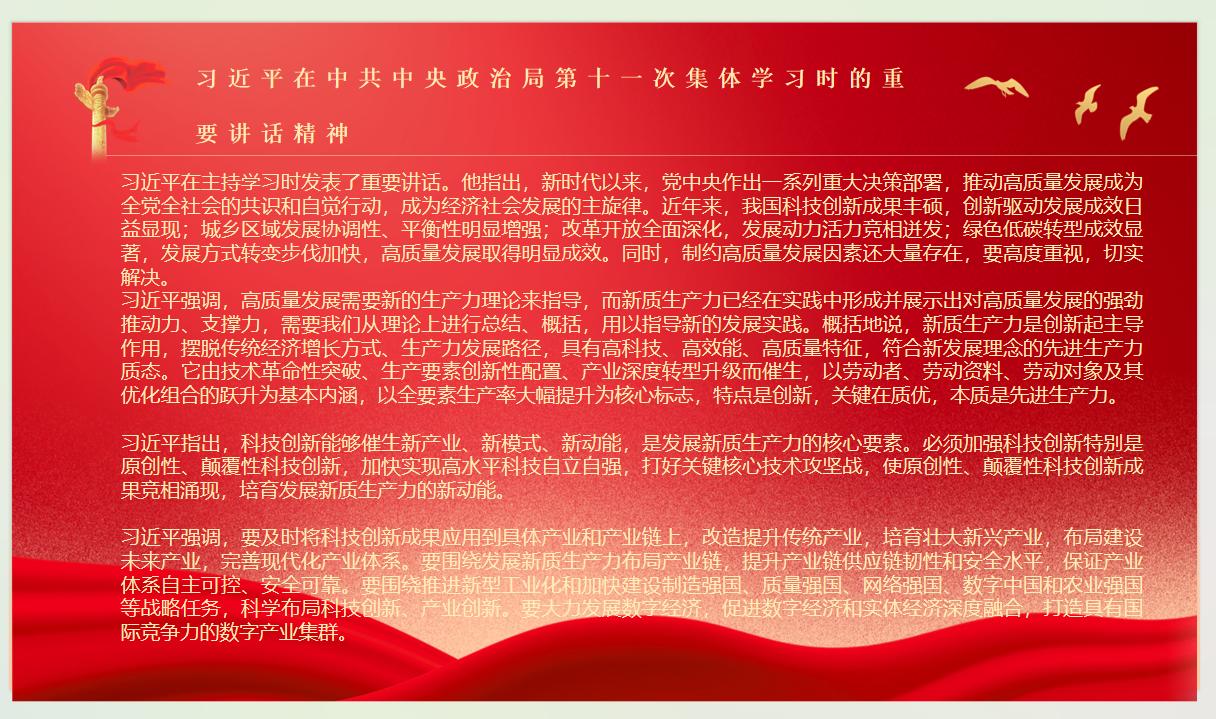 习近平总书记在主持学习时强调,必须牢记高质量发展是新时代的硬道理,全面贯彻新发展理念,把加快建设现代化经济体系、推进高水平科技自立自强、加快构建新发展格局、统筹推进深层次改革和高水平开放、统筹高质量发展和高水平安全等战略任务落实到位,完善推动高质量发展的考核评价体系,为推动高质量发展打牢基础。发展新质生产力是推动高质量发展的内在要求和重要着力点,必须继续做好创新这篇大文章,推动新质生产力加快发展。