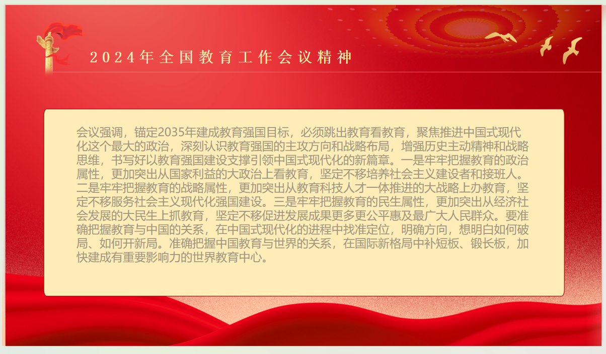 1月11日,2024年全国教育工作会议在北京召开。会议以习近平新时代中国特色社会主义思想为指导,深入学习贯彻习近平总书记关于教育的重要论述,总结工作,分析形势,安排部署全年教育工作。会议强调,要深刻领悟“两个确立”的决定性意义,坚持稳中求进、以进促稳、先立后破,把组织实施教育强国建设规划纲要作为工作主线,把全面提高人才自主培养质量、支撑高水平科技自立自强作为主攻方向,把进一步全面深化改革作为根本动力,在教育的数字化、国际化、绿色化方向上开辟发展新空间,加快建设高质量教育体系,办好人民满意的教育,培养德智体美劳全面发展的社会主义建设者和接班人,为全面推进中华民族伟大复兴作出新的更大贡献。